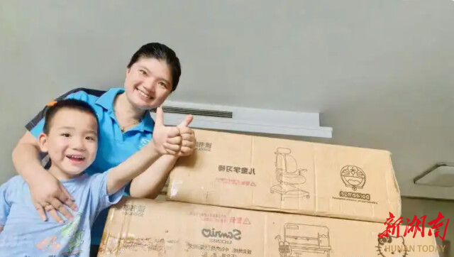 外卖骑手刘新云收到长沙工会驿站捐赠的儿童书桌。(资料图片)通讯员 摄