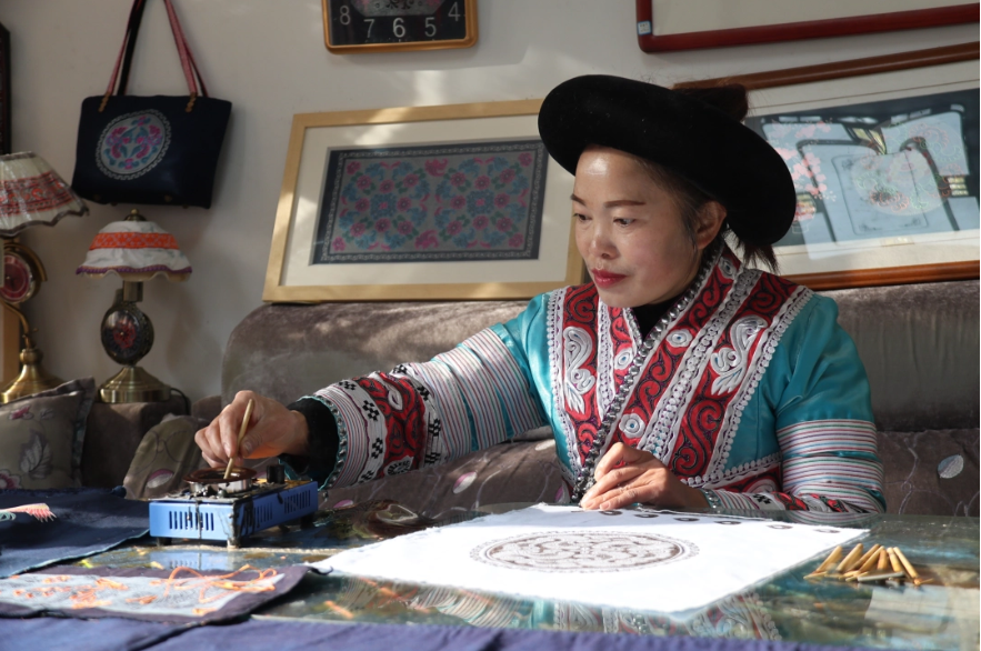 杨艳以针为笔,以线为墨,将娘家织金的蜡染和婆家黔西的图案结合,创新制作出彩染绣品。在不断创新的过程中,杨艳和丈夫在接受政府的相关培训后,提升了版权意识,为自己的100多幅作品申报了版权。
