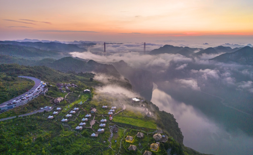 2025年7月27日,贵州省黔西市境内乌江干流鸭池河左岸悬崖上的花都里化屋野奢度假营地,可以远眺乌江山水和鸭池河大桥,吸引众多游客前来避暑度假。影像中国