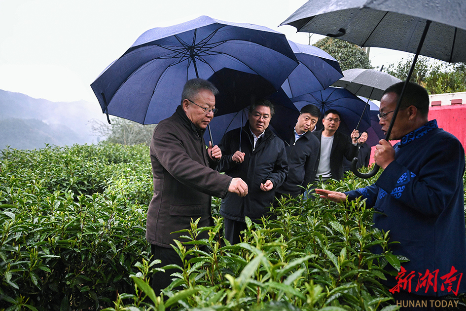 3月23日,沈晓明来到吉首市马颈坳镇隘口村黄金茶种植基地调研。
